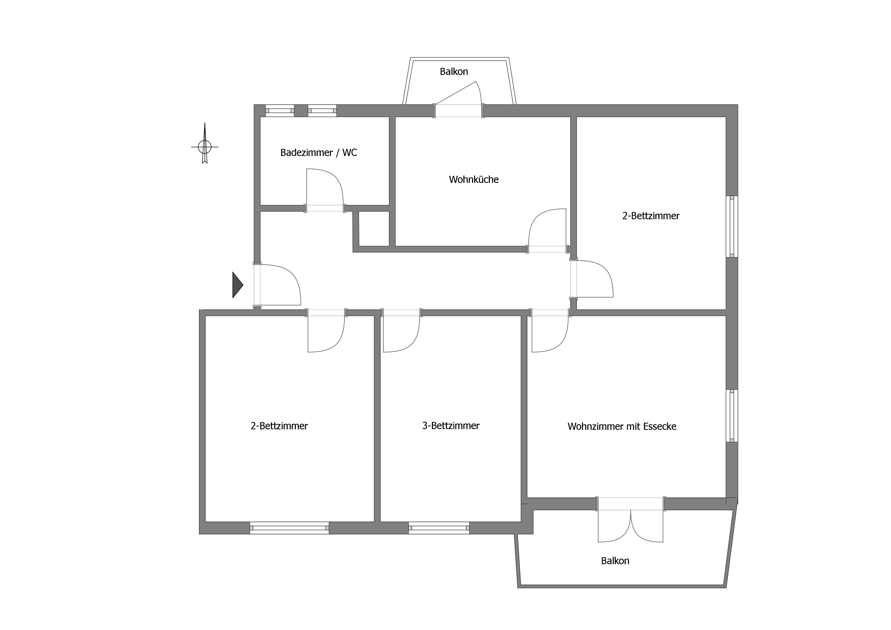 Wohnzimmer mit Essecke Wohnküche 1 Bad mit Dusche/WC, 2 Doppelbettzimmer 1 Dreibettzimmer 2 Balkone